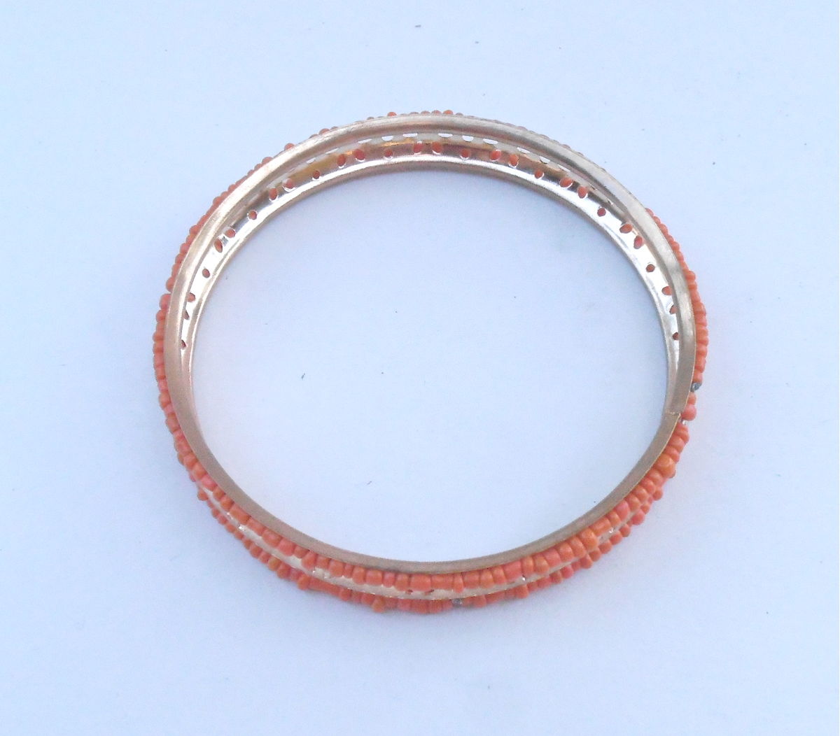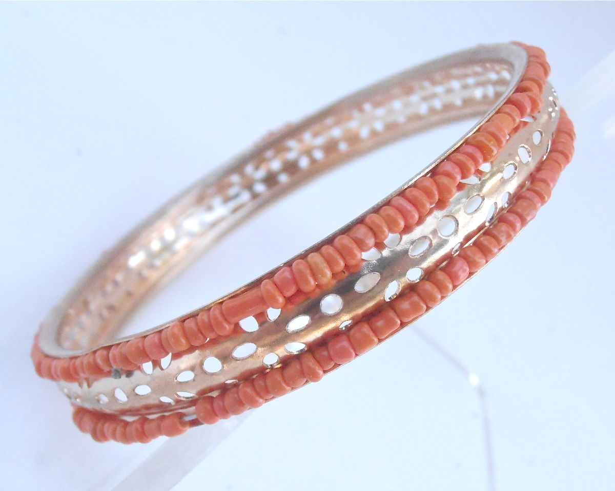 Vintage Faux Coral Gold Tone Bracelet Tiny Seed Peach Beads Bangle Stackable Orange Petals Pin Holes 8.25 Inches Orange Tangelo Tangerine