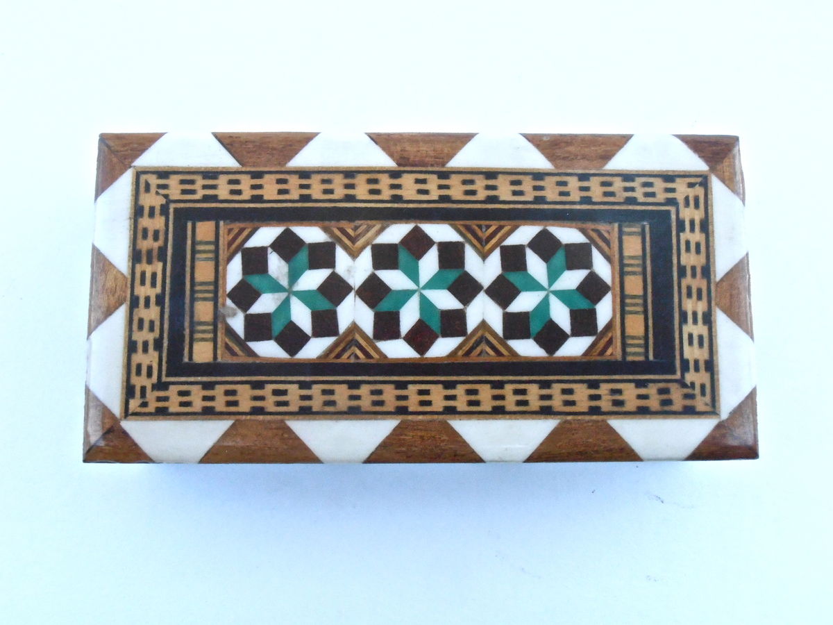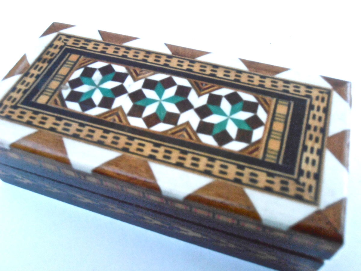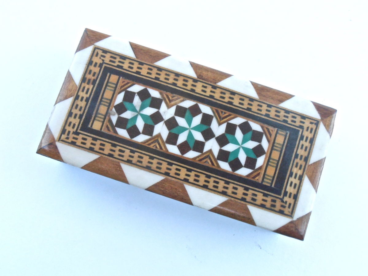 Vintage Spanish Rectangular Wooden Box Inlay Marquetry Inlaid Wood Taracea Green Brown Case Granada Moor Mosaic Quilt Pattern Tiered Storage