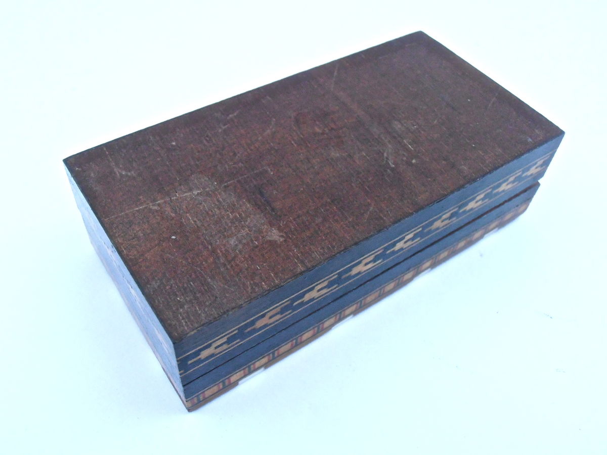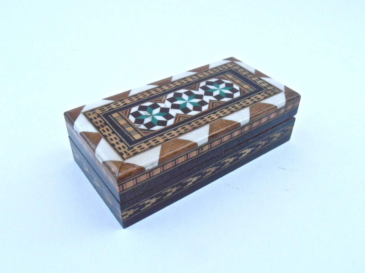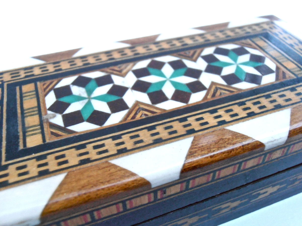 Vintage Spanish Rectangular Wooden Box Inlay Marquetry Inlaid Wood Taracea Green Brown Case Granada Moor Mosaic Quilt Pattern Tiered Storage